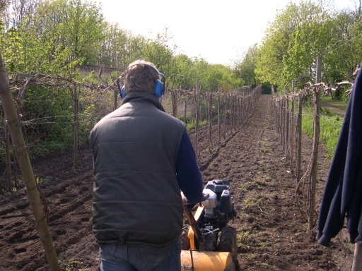Arbejdet i vinmarken består i løbet af sommeren i at holde jorden under vinstokkene ren med havefræseren og hakkejernet. Jeg sprøjter ca. tre gange forebyggende mod meldug og vinskimmel. De mest vildtvoksende af planterne styres ved at føre de ustyrlige ranker ind mellem de faste dobbelttråde.