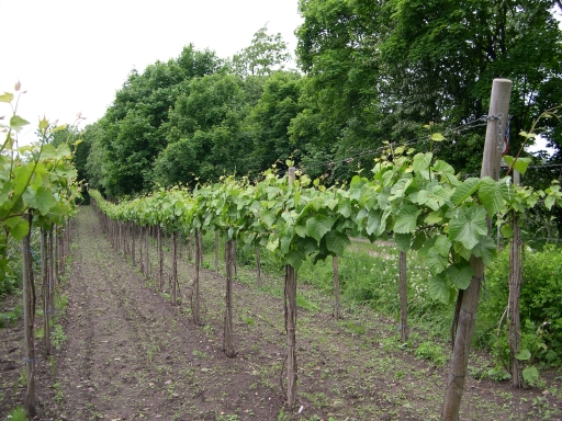 På arealerne dyrker vi ca. 500 vinstokke espalieret efter et modificeret Sylvoz system. Arealernes form har gjort det mest praktisk at lægge rækkerne med orienteringen øst - vest, og det virker tilsyneladende udmærket. Anbefalingen herhjemme er ellers at placere rækkerne nord - syd.