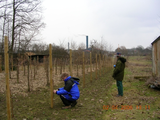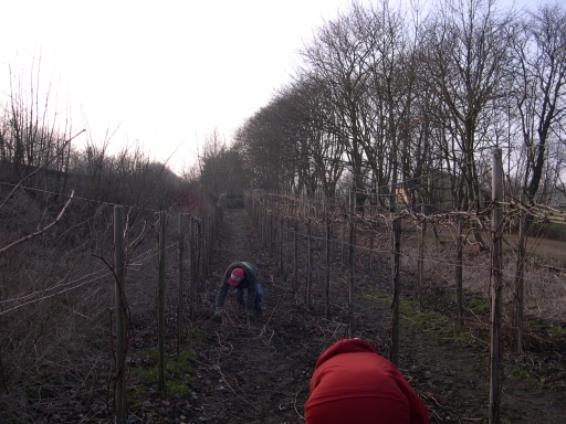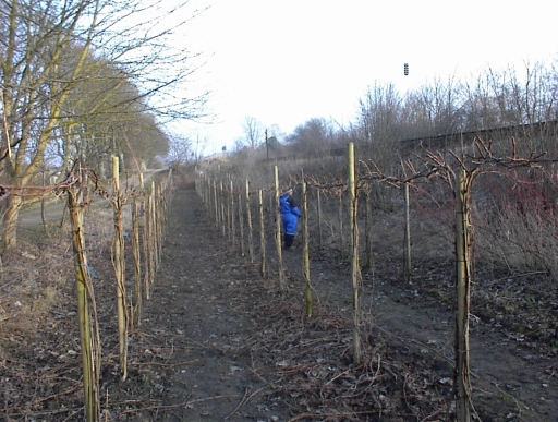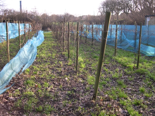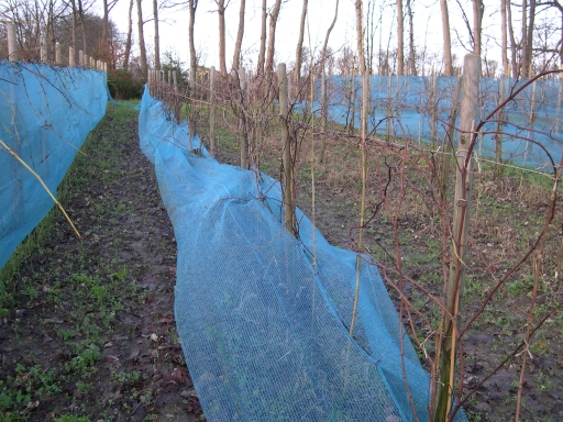 Vi måtte sætte dobbelt net på Cabernet Cortis rækken til venstre. De unge vinstokke bar druer i næsten hele espalierets højde.
